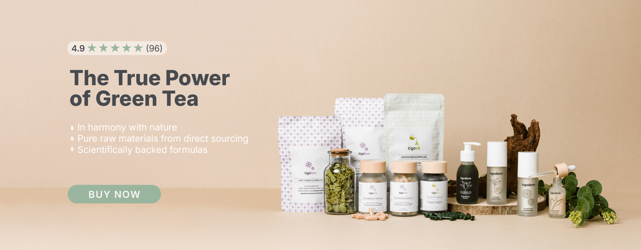 Our innovative products with green tea extracts combine high-quality nutritional supplements and natural cosmetics. The power of green tea for balance and radiance – sustainable, scientifically sound, and transparent. With glass packaging and a refill system for less waste, developed with experts and open communication about our ingredients.